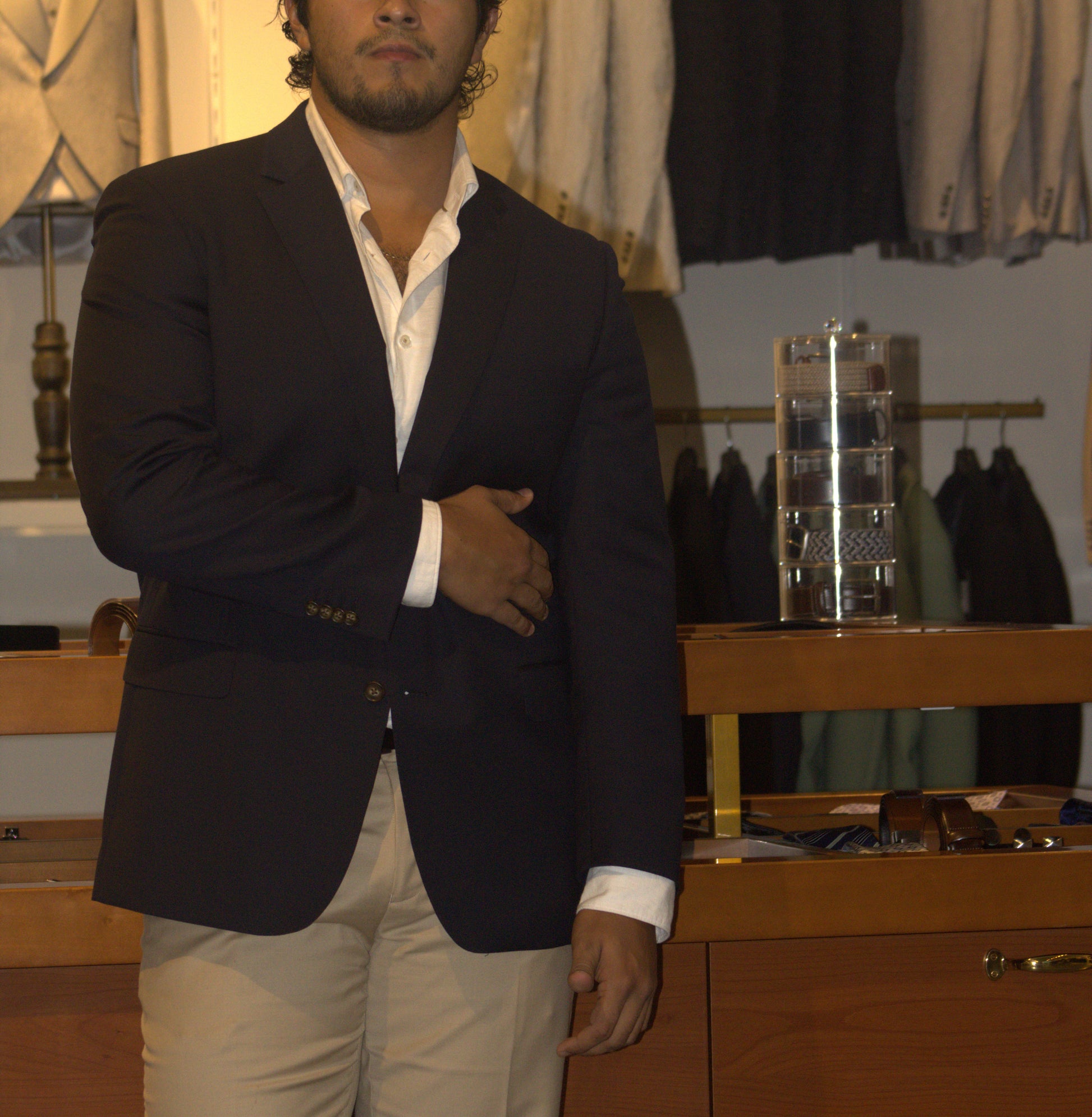 Crafted from fine Wool 140s, this navy blazer offers a refined, timeless look essential for any man's wardrobe. Its expert tailoring provides a sharp silhouette, available in both classic and slim fits to ensure a perfect match for your style and comfort needs. Ideal for professional settings or sophisticated occasions, this blazer combines tradition with versatile elegance.